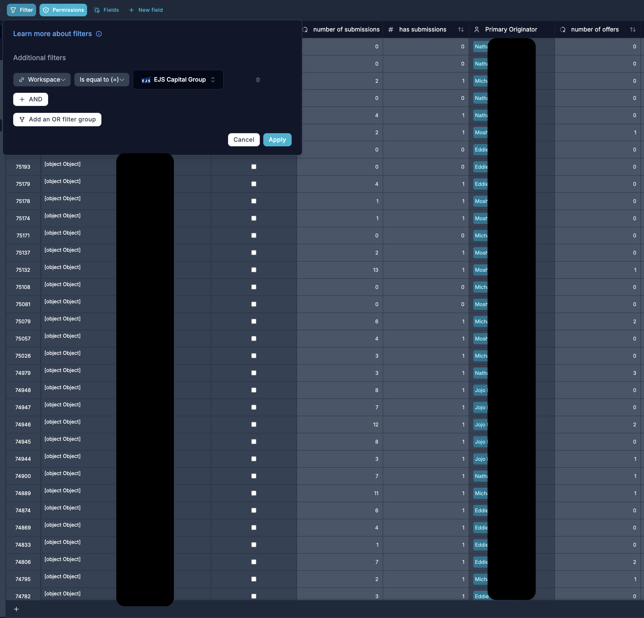 Thanks for the suggestions. I can’t remove the backend permissions because this is a production environment. I did remove all the frontend filters, though, and the Table displays more than 0 records. But it shows that all records have “No Value” for the Primary Originator field: